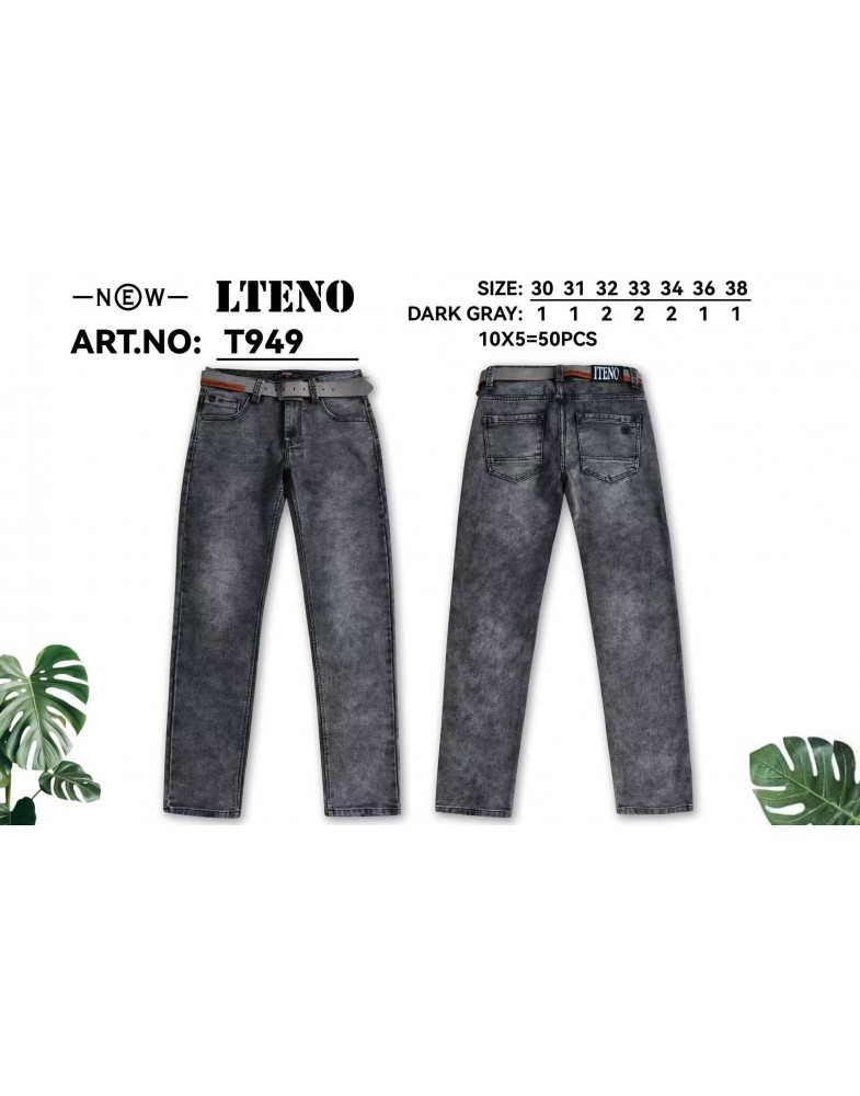 The T949 jeans are made from washed black-gray denim, featuring natural fading for a vintage distressed look.