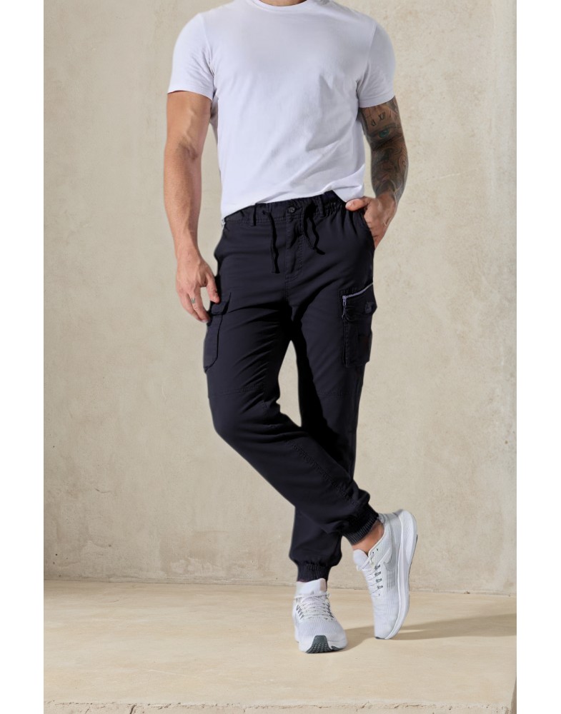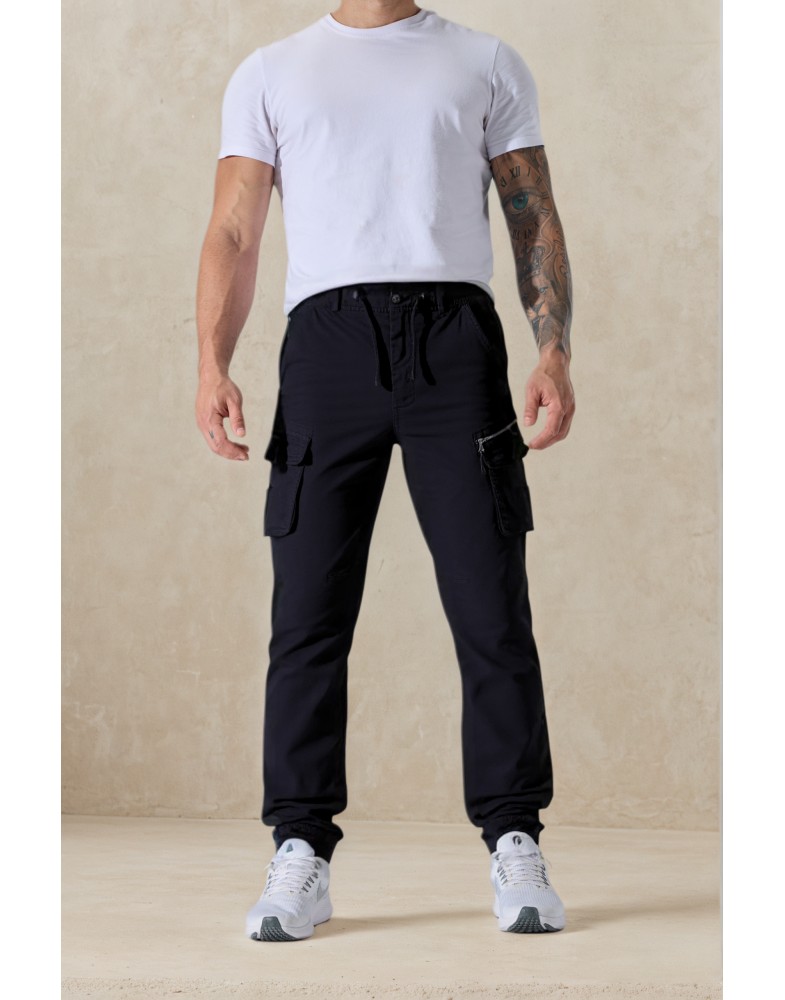 The 8995-1 black cargo pants are made from high-density fabric that resists wrinkles and holds its shape. Smooth to the touch and structured in appearance for a confident, masculine look. Designed with a mid-rise fit, elastic waistband, and drawstring for comfort and adjustability across body types. Functional 3D cargo pockets on both thighs add practicality and a bold urban edge. The rear features a stitched triangle logo patch, subtle yet distinctive. Cuffed hems offer a secure, tapered fit and elevate the sporty-casual style. Ideal for daily wear, commuting, or styling with hoodies and tees for a streetwear-ready outfit.